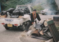 | 東会長は、ガラクタを前に少しお疲れ気味? | 会計の山口さんは、相変わらず元気いっぱい。 ガラクタゴミと格闘中!! |